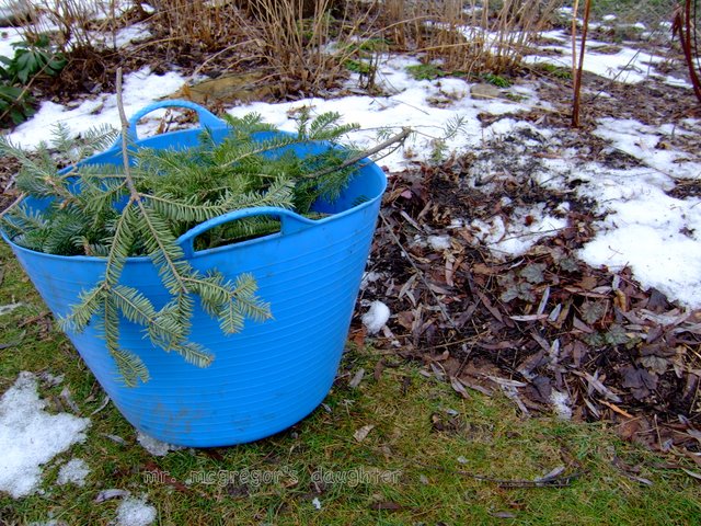 The melted snow uncovered many plants for the first time since the beginning of December. The snows came before the ground froze, so I was unable to put down winter mulch. The plants were safe under two feet of snow, but after the thaw, in addition to tender new growth freezing, there's the danger of frost heaving. Now the winter mulch needs to be put down to keep the ground frozen. The best sort of winter mulch is the old boughs of the Christmas tree. Because of allergy problems, we have an artificial tree, so I was able to gather only a tub trug full of them from the neighbors' trees left at the curb.