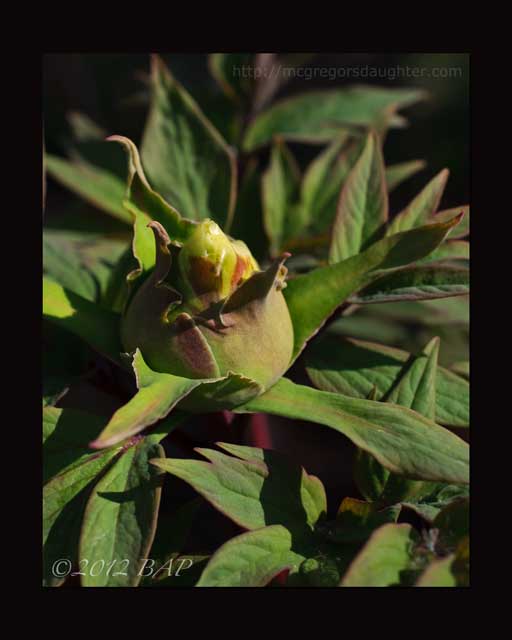the tree peony has finally bloomed. I say finally not because it is late (it is, in fact about a month early), but because I have been watching one bud in a state of suspended animation for over a month.
