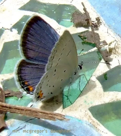I don't know what they are, but they're always hanging around.Among several small bluish butterflies that visit, I managed to find this Eastern Tailed-Blue at rest on a camouflaging stepping stone.